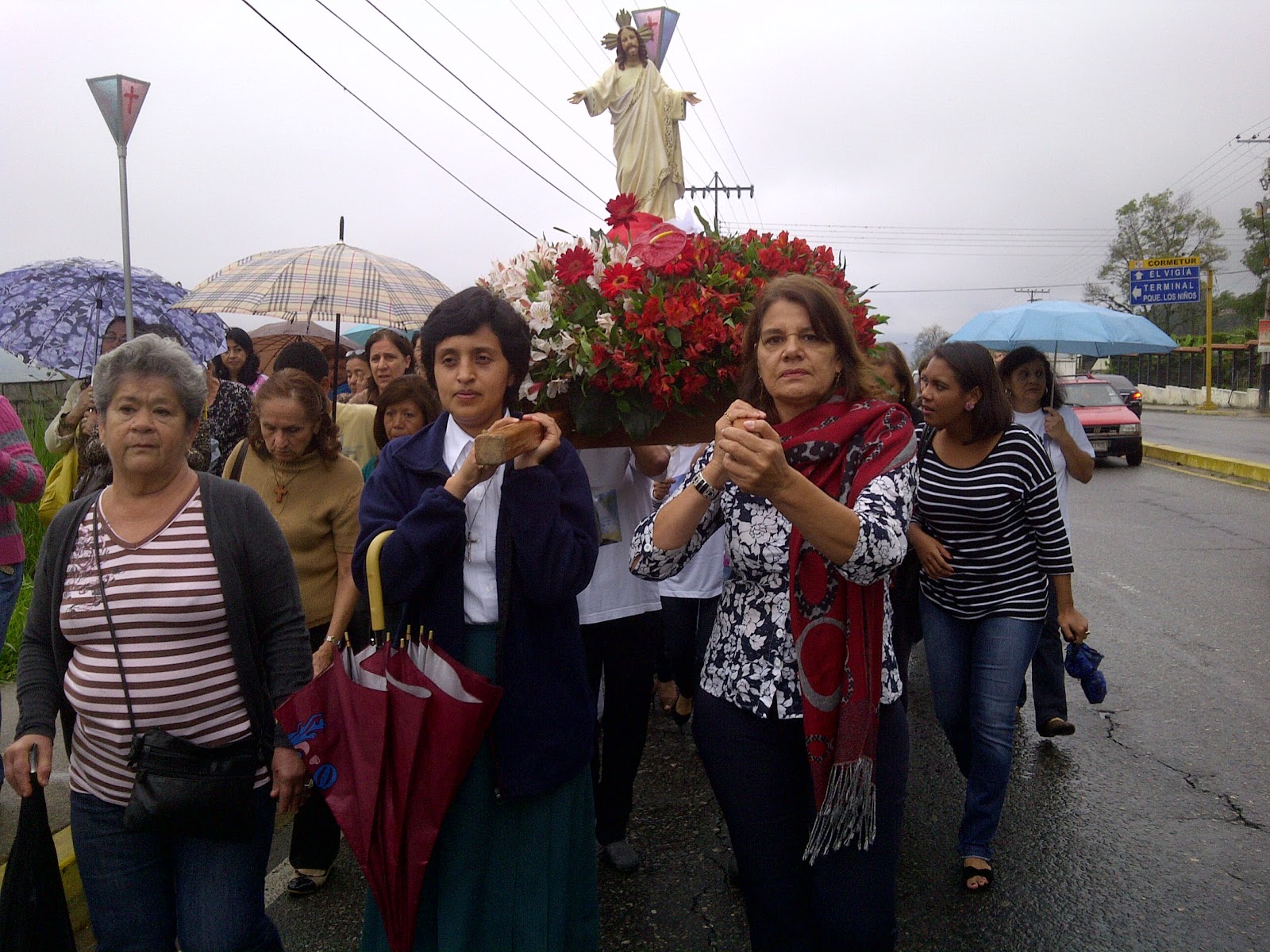 Luego de rezar la Coronilla de la Divina Misericordia, entre cantos, lluvia, paraguas y morteros, los asistentes caminaron por la Urbanización Los Sauzales, Avenida Las Américas y Avenida Los Próceres.
